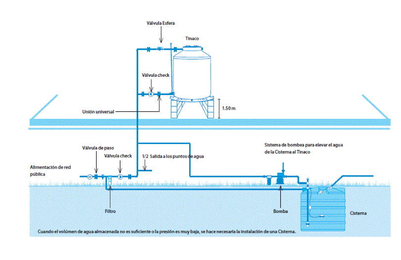 Haz llegar la toma publica directamente al tinaco y la salida de éste a las tomas de la casa, (si tienes buena presión y llega el agua hasta tu tinaco no necesitas sisterna ni bomba). Ésta configuración tiene sus inconvenientes, la ideal es la que se muestra en el contenido del artículo.